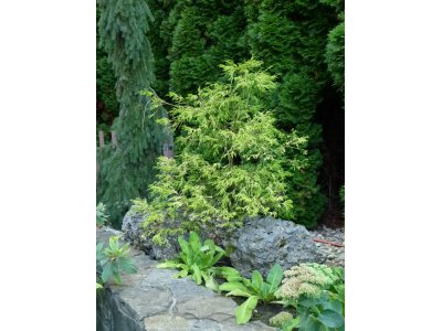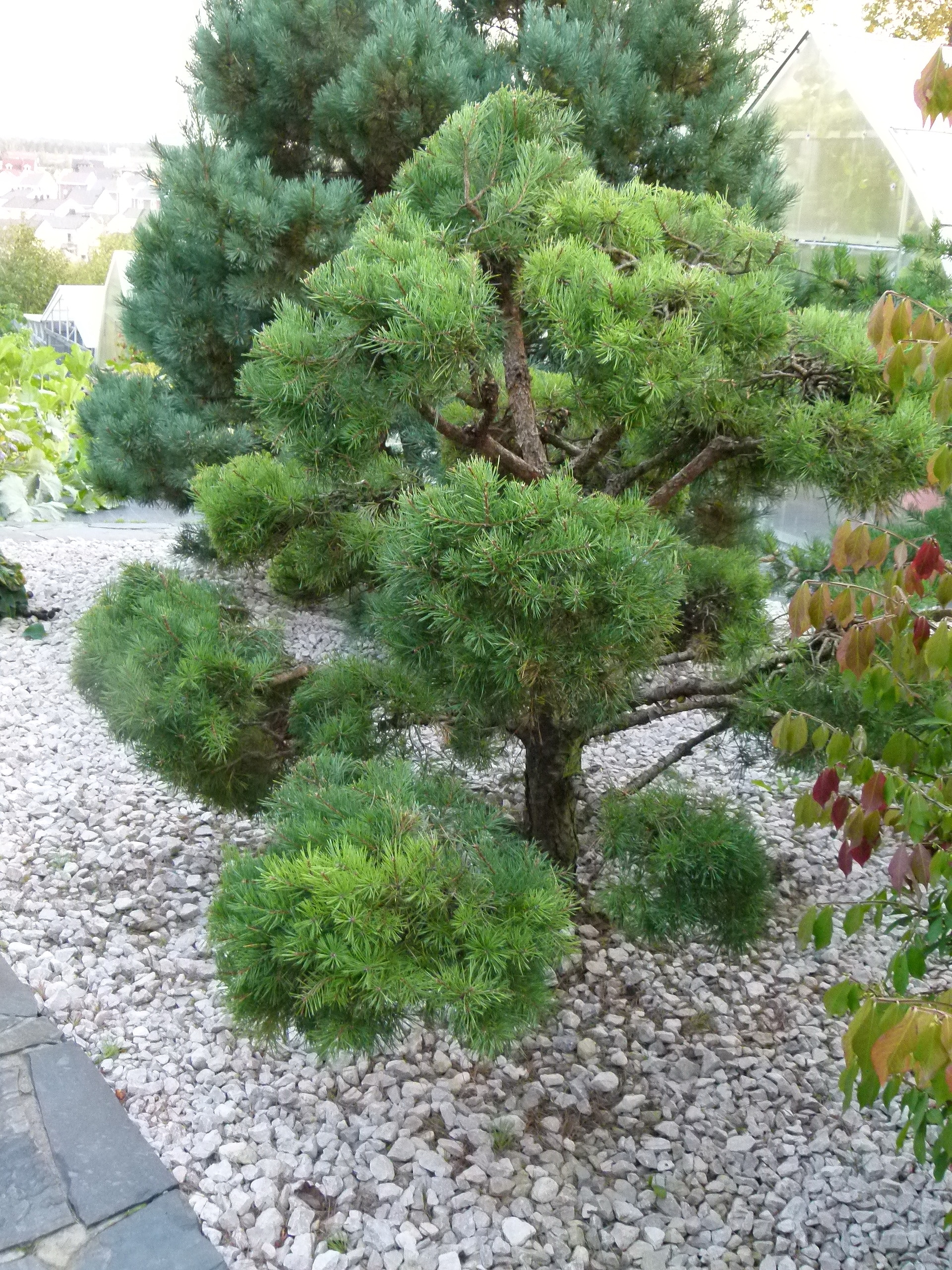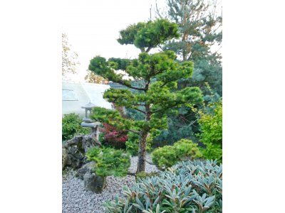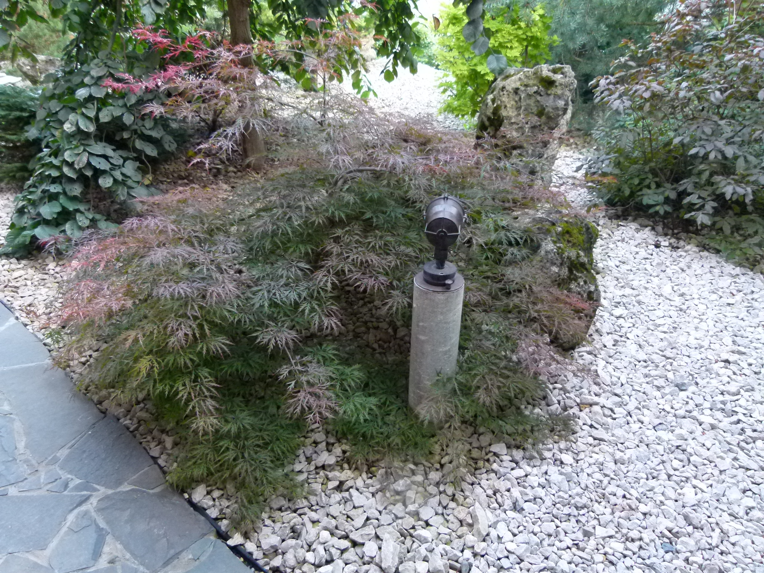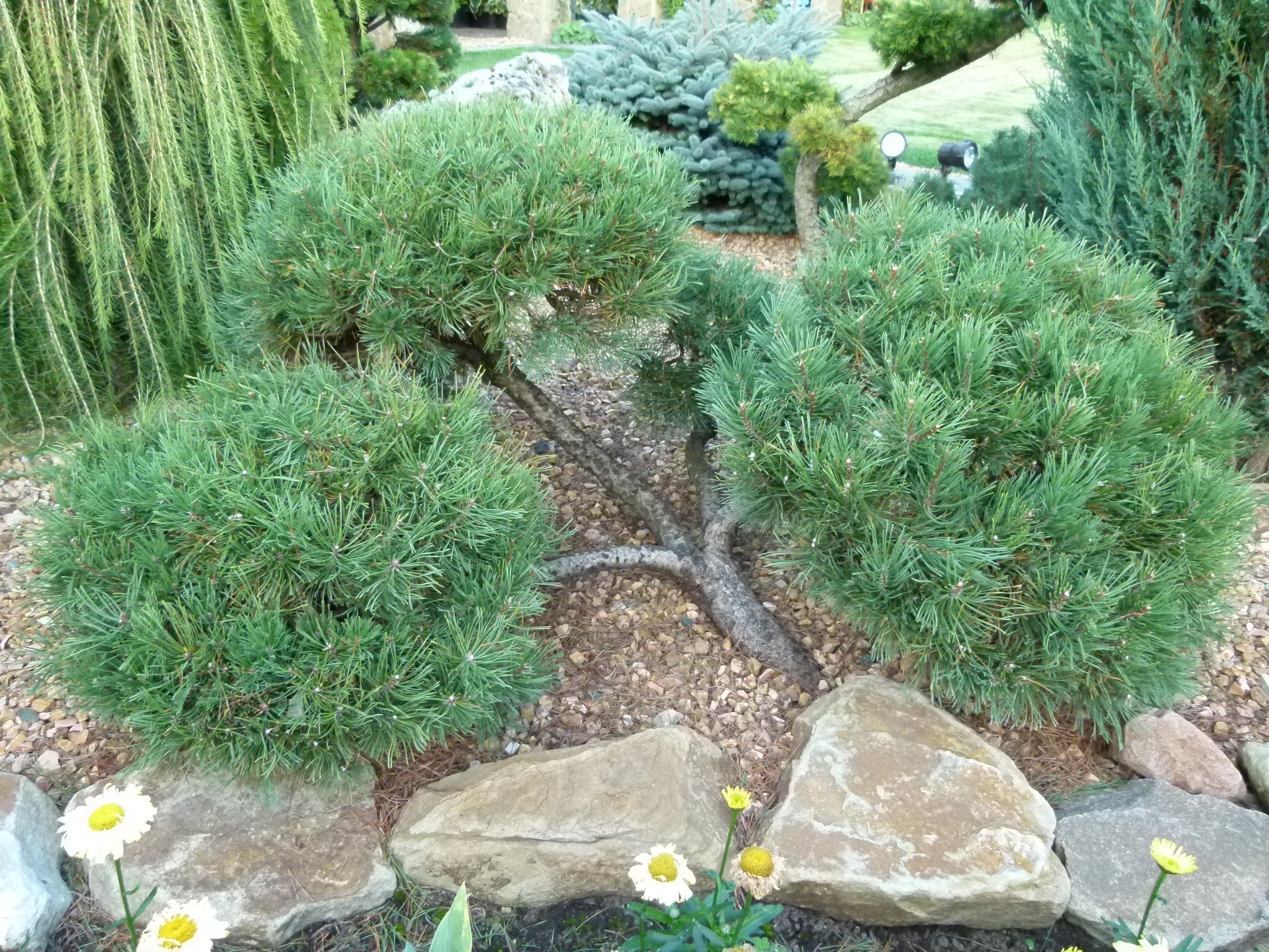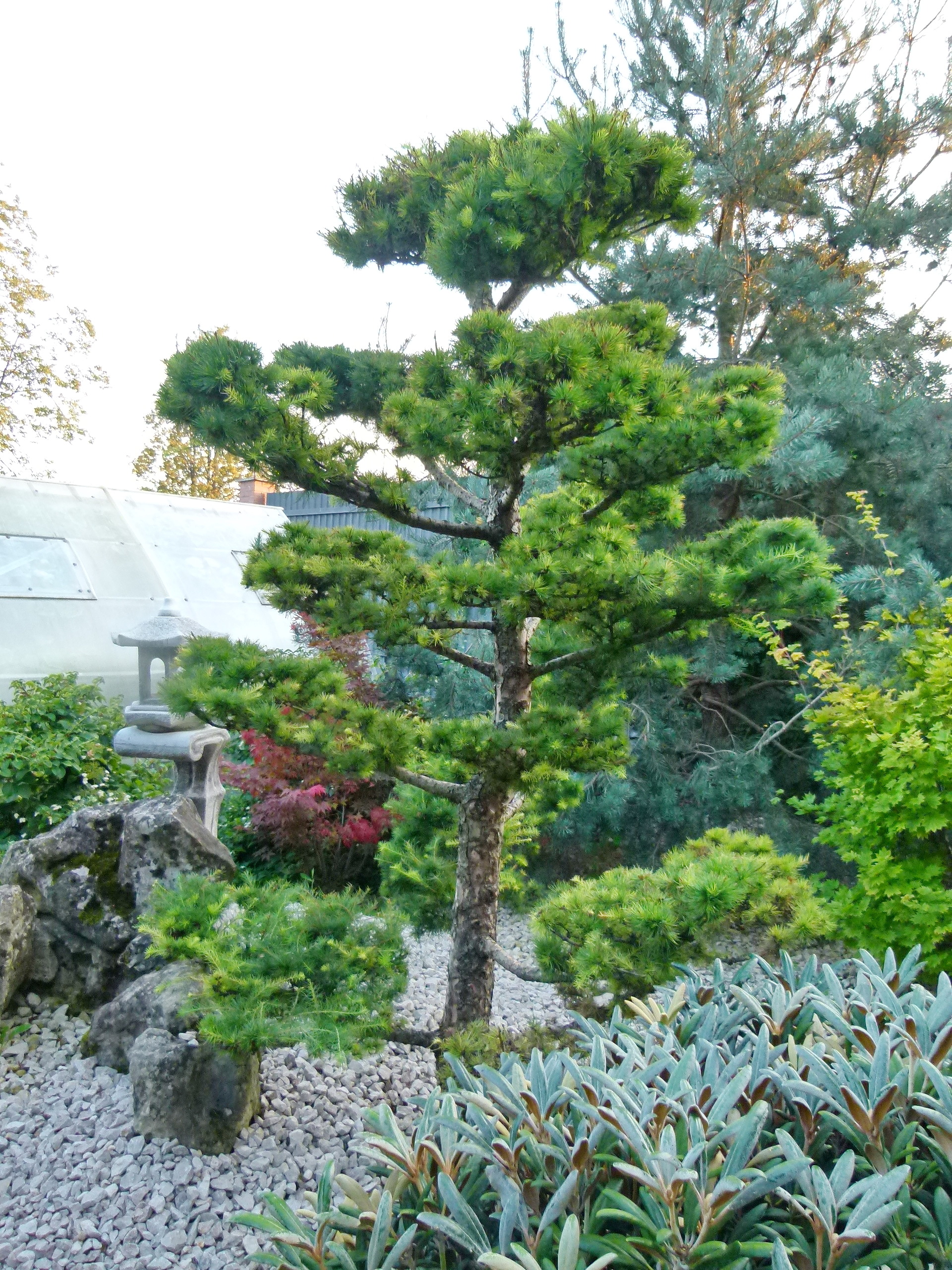 В японском саду: вяз Кампердуани горный, сосна Гном, лиственница бонсай, боярышник бонсай, клен пальмолистный, лиственница японская Стиф Випер, можжевельник китайский Хетци бонсай, рододендрон Канинтхам Вайт, сосна Банкса, сосна горная бонсай и др.