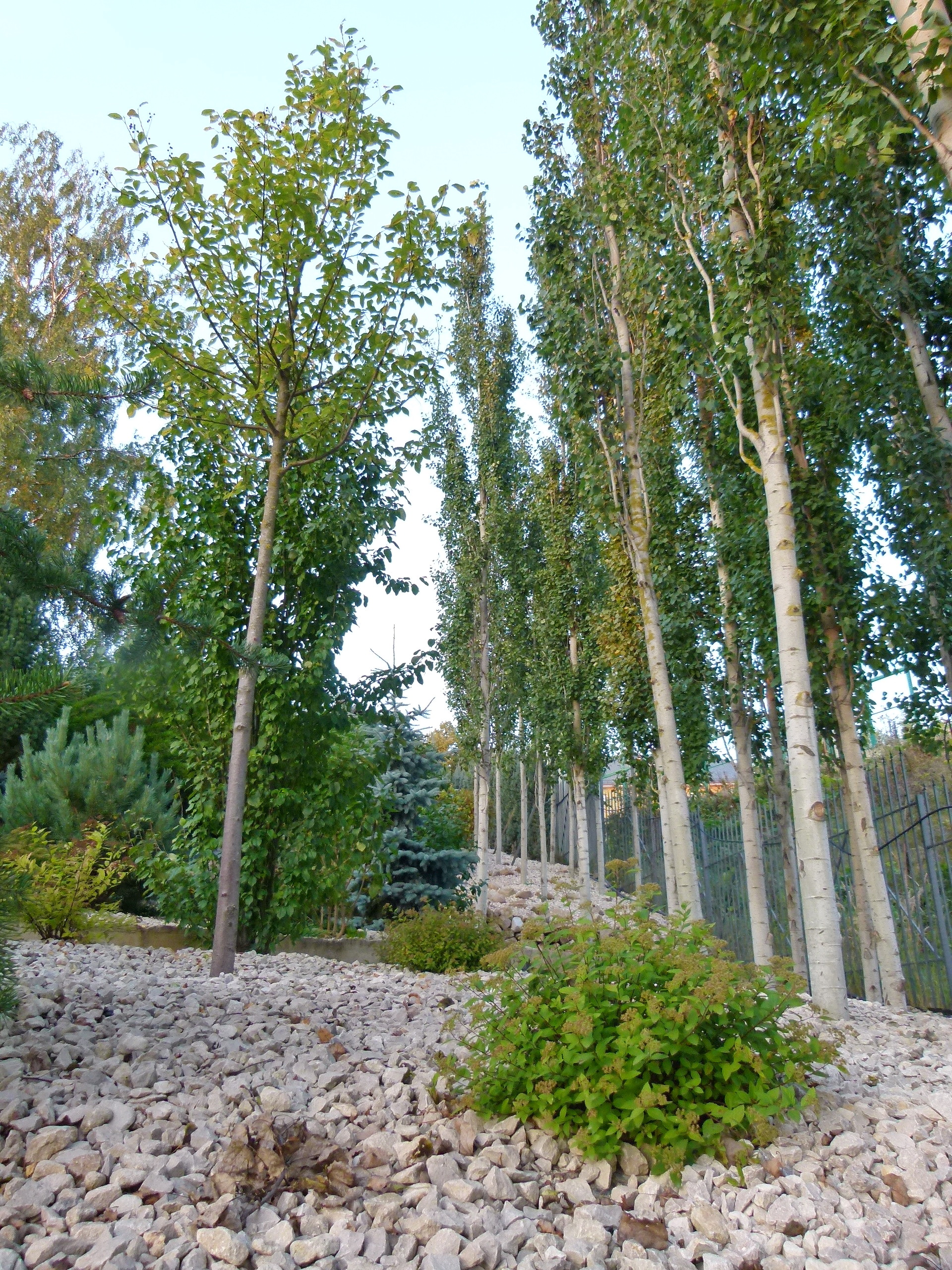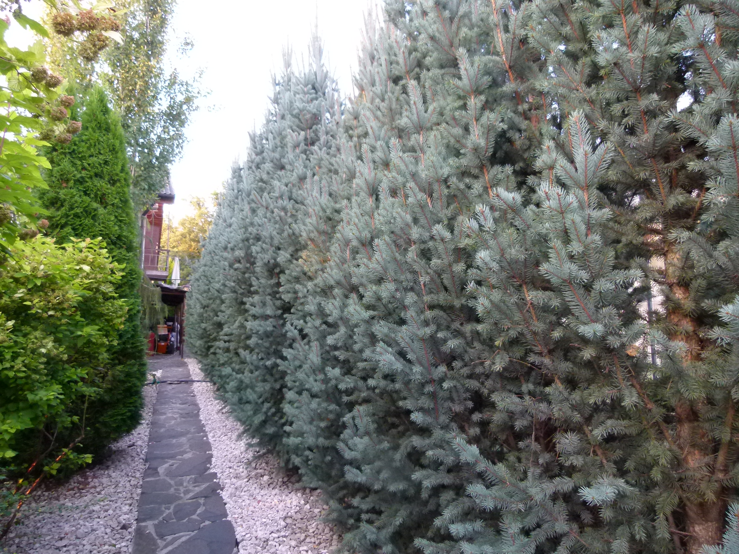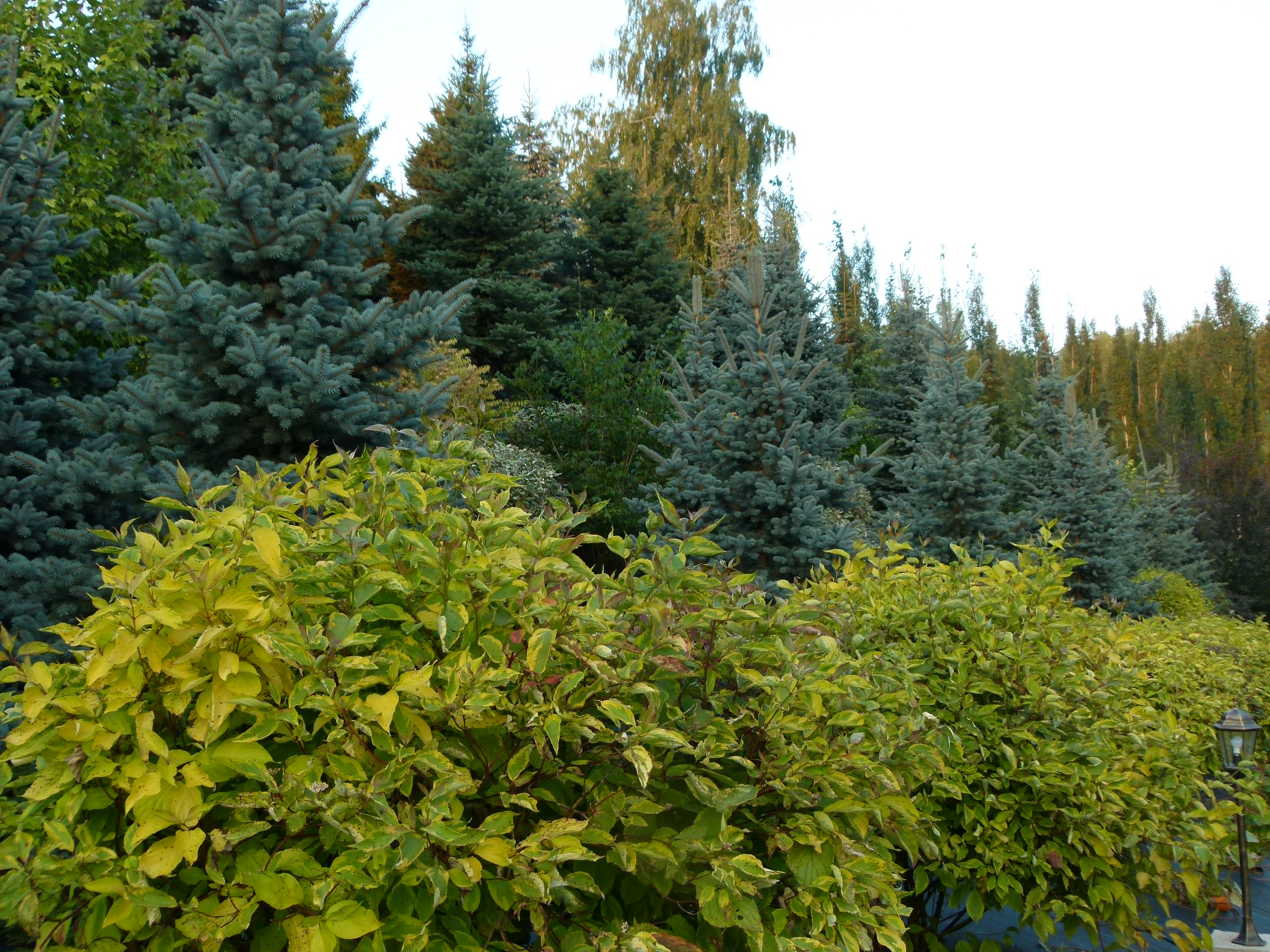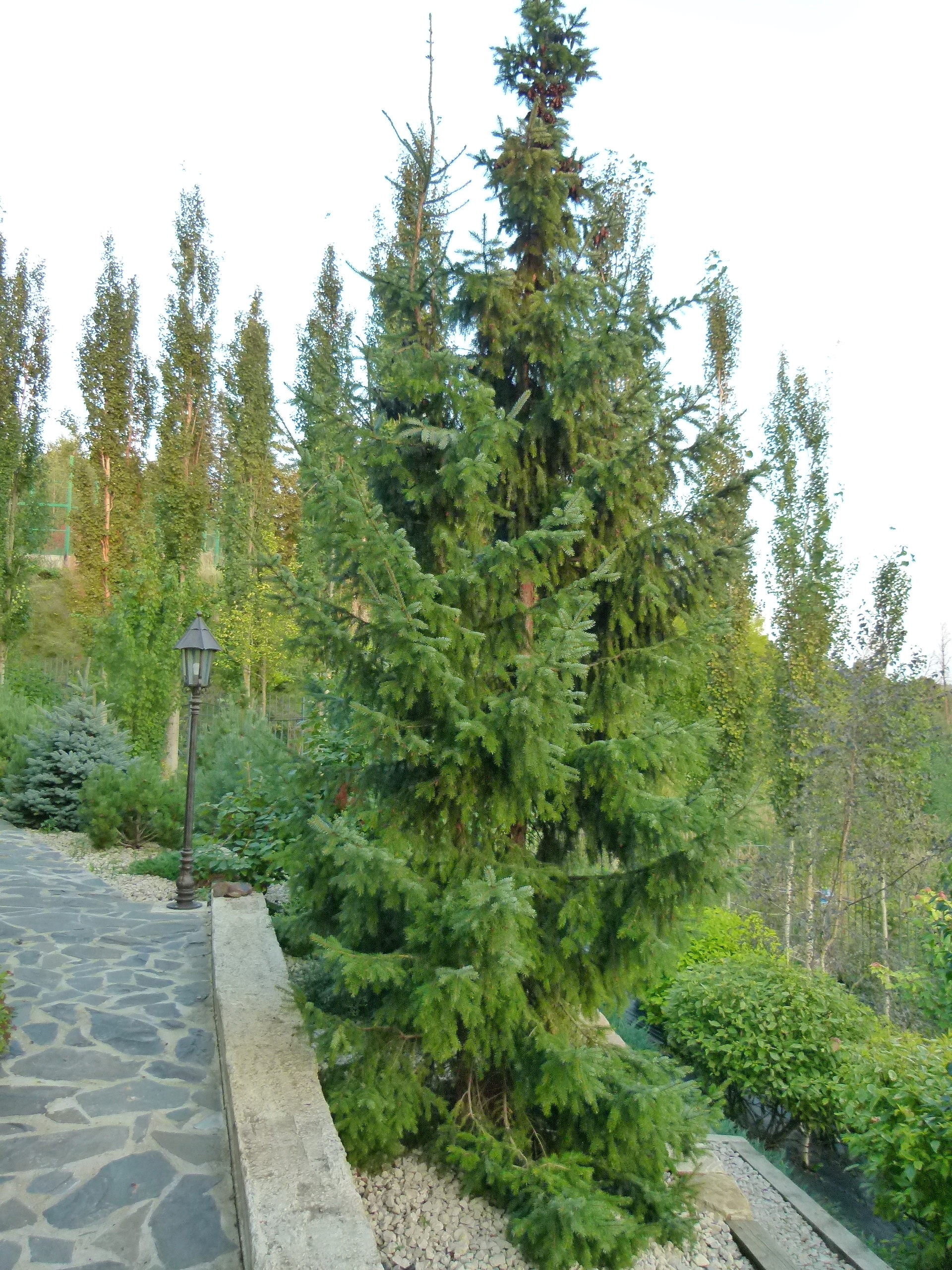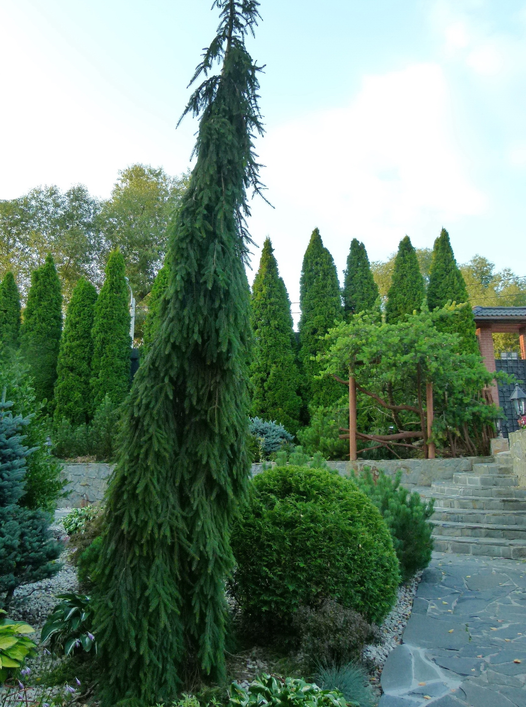 А вот остальные растения привезены из лучших питомников мира: плакучая ель, сосна Банкса из Германии (на дату покупки ей было 60 лет), туи по 6-7 метров, пихта корейская, японский клён (красный), ничуть не пугающая монстроподобная ель (сорт Виргата), ель Коника, редкая сосна (жёлтая зимой), сосна Веймутова, сибирская пихта, можжевельник китайский, плакучая лиственница и плакучий вяз, горные 30-летние сосны, сербские ели, высокие пирамидальные осины, берёза полезная.