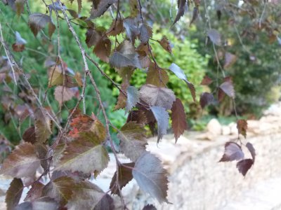 На заборе увивается виноград, меняющий зимой, как хамелеон, свою окраску на бордовую.