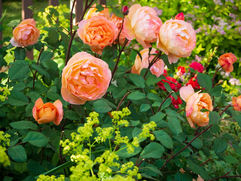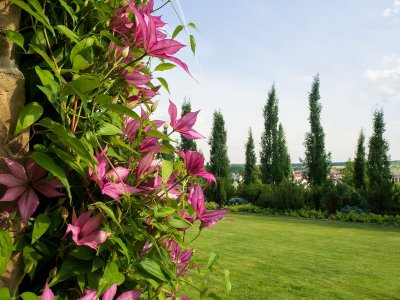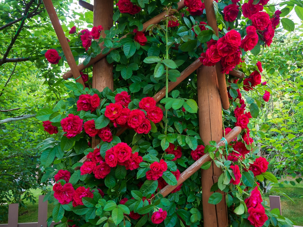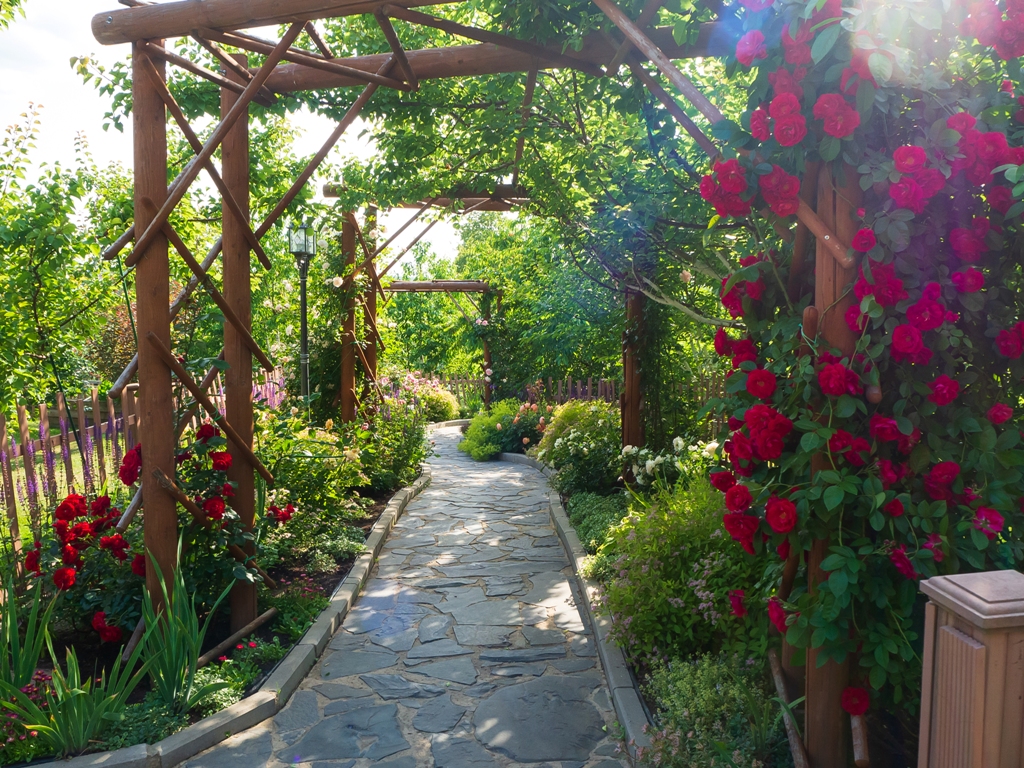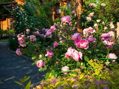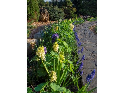 Собранные воедино зимостойкие сорта роз составляют основу для двух цветников непрерывного цветения длиной по 50 метров. Два розария и подпорная стенка с посадочными «гнёздами» приютили коллекцию карликовых высокогорных растений. Украшенные вьющимися растениями перголы дадут тень в жаркий день и порадуют взор. На участке красуются десятки крупномерных красивоцветущих кустарников: сирени, рододендроны, азалий, магнолии, спиреи, калины, жимолости каприфоль, гортензии черешковой. Для удобства организован автоматический полив.