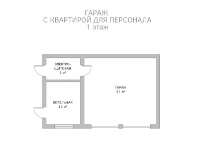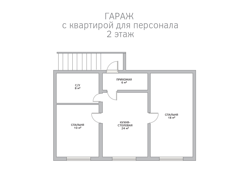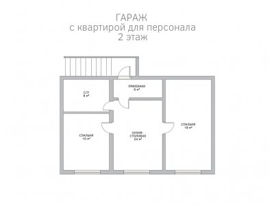 Квартира для персонала с отдельным входом с участка по лестнице: прихожая, кухня-столовая 24 кв.м, 2 спальни (10 и 18 кв.м), санузел 8 кв.м.