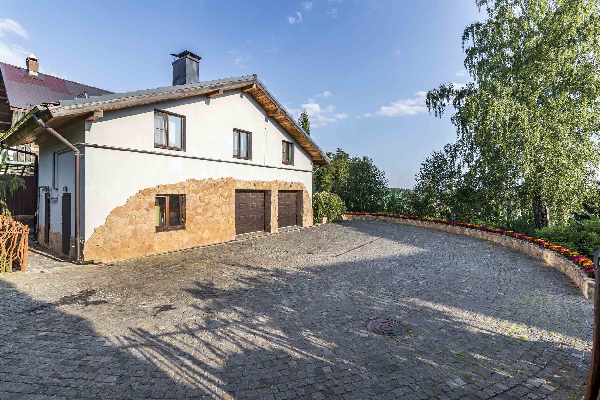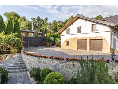 Двухэтажное кирпичное строение 118 кв.м, вмещает в себя гараж на 2 машино-места, отдельную квартиру для персонала и помещения для инженерного оборудования. Перед гаражом на участке - большая площадка для машин (на 6-8 авто), выложена брусчаткой из натурального гранита. Перед участком оборудована еще одна площадка на 4 автомобиля.