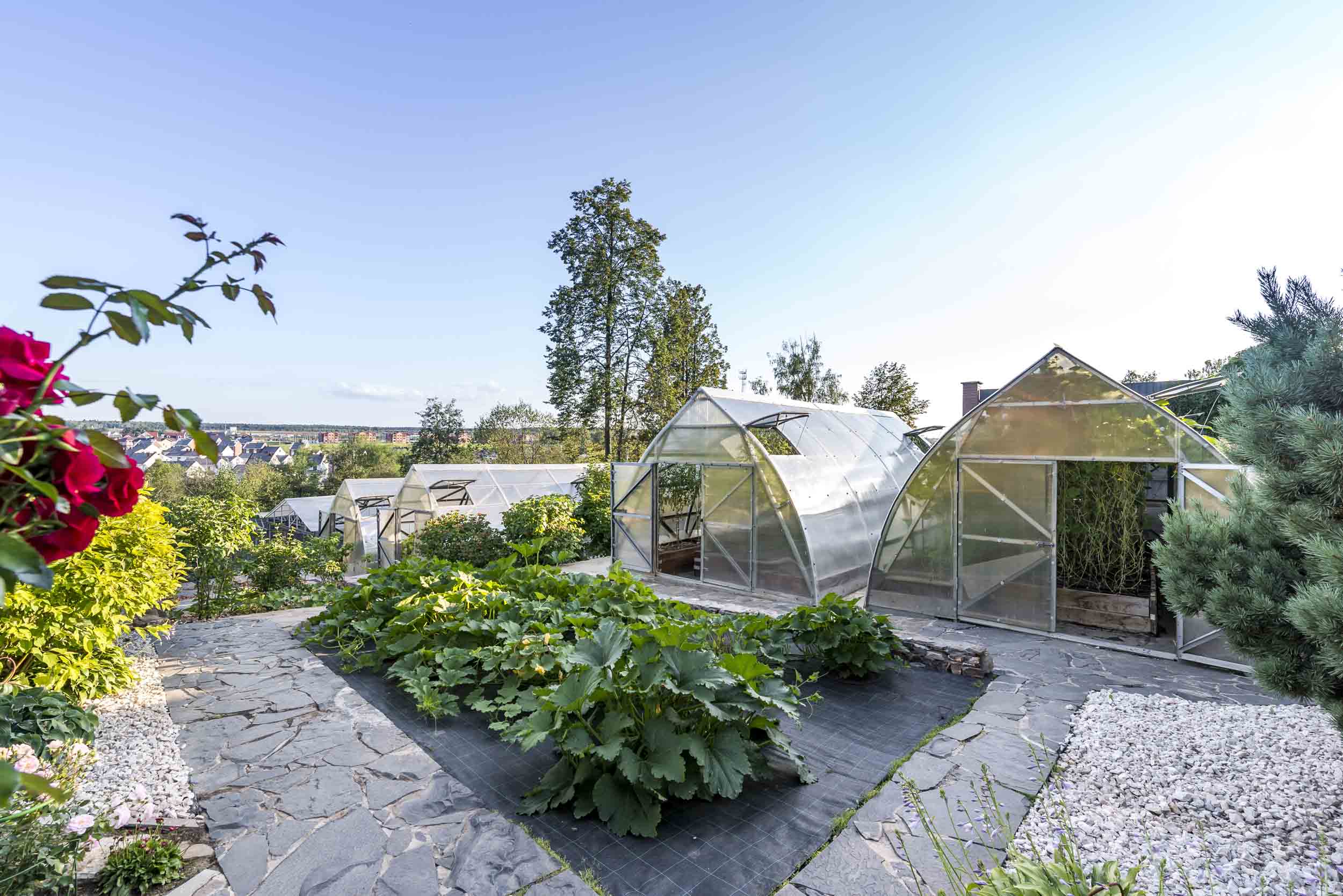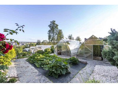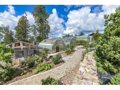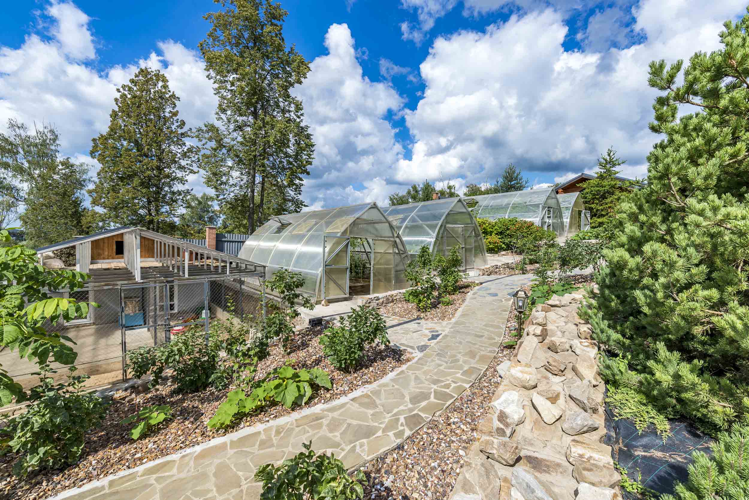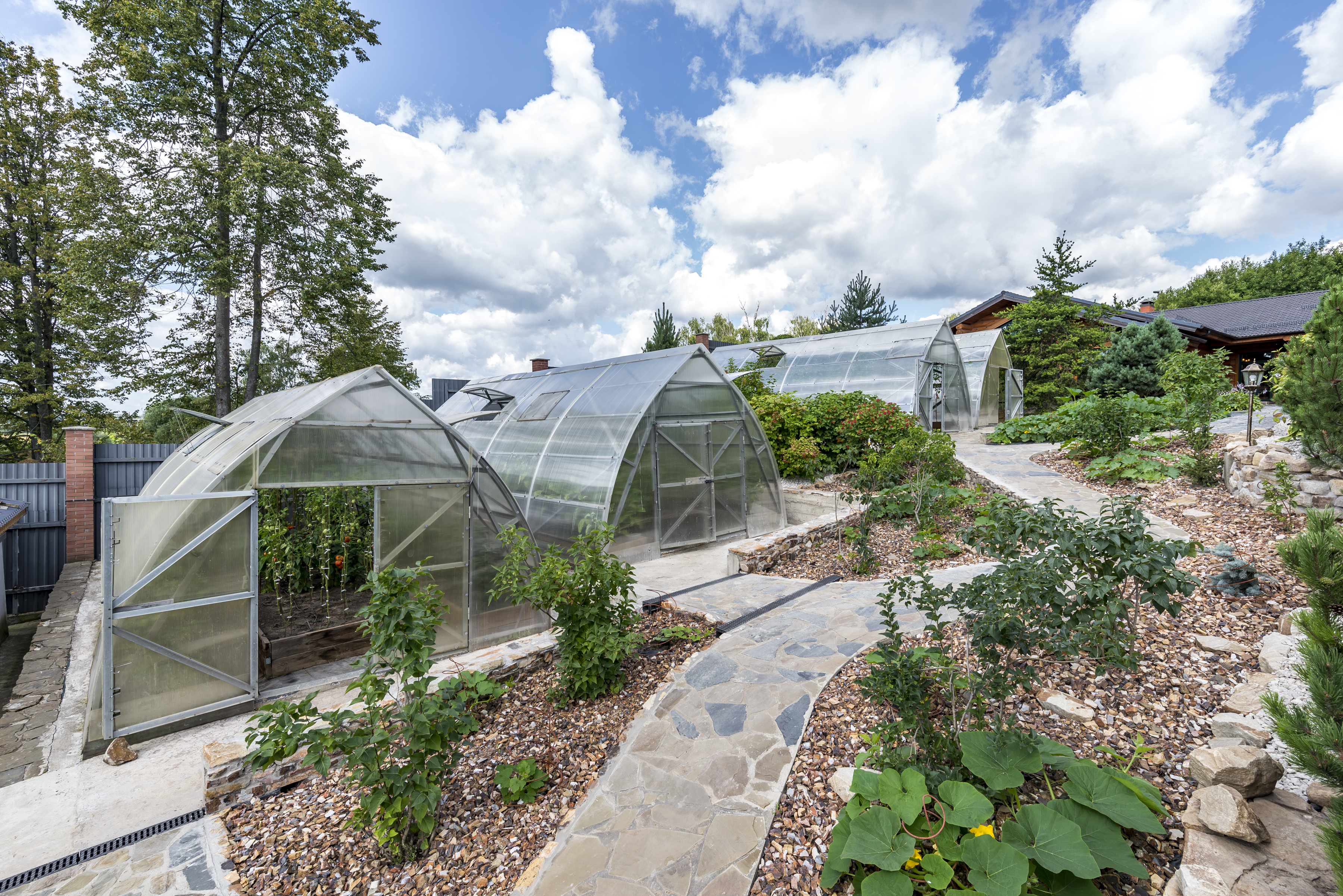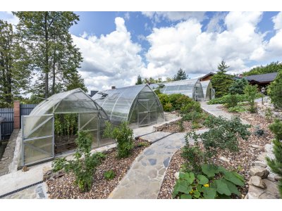В этой усадьбе нет необходимости покупать овощи к столу: различные сорта томатов, огурцы, баклажаны и болгарский перец - годовые запасы этих овощей уже сейчас приносят 4 теплицы 8х4 м. Каждая теплица оснащена системой автоматического полива.
