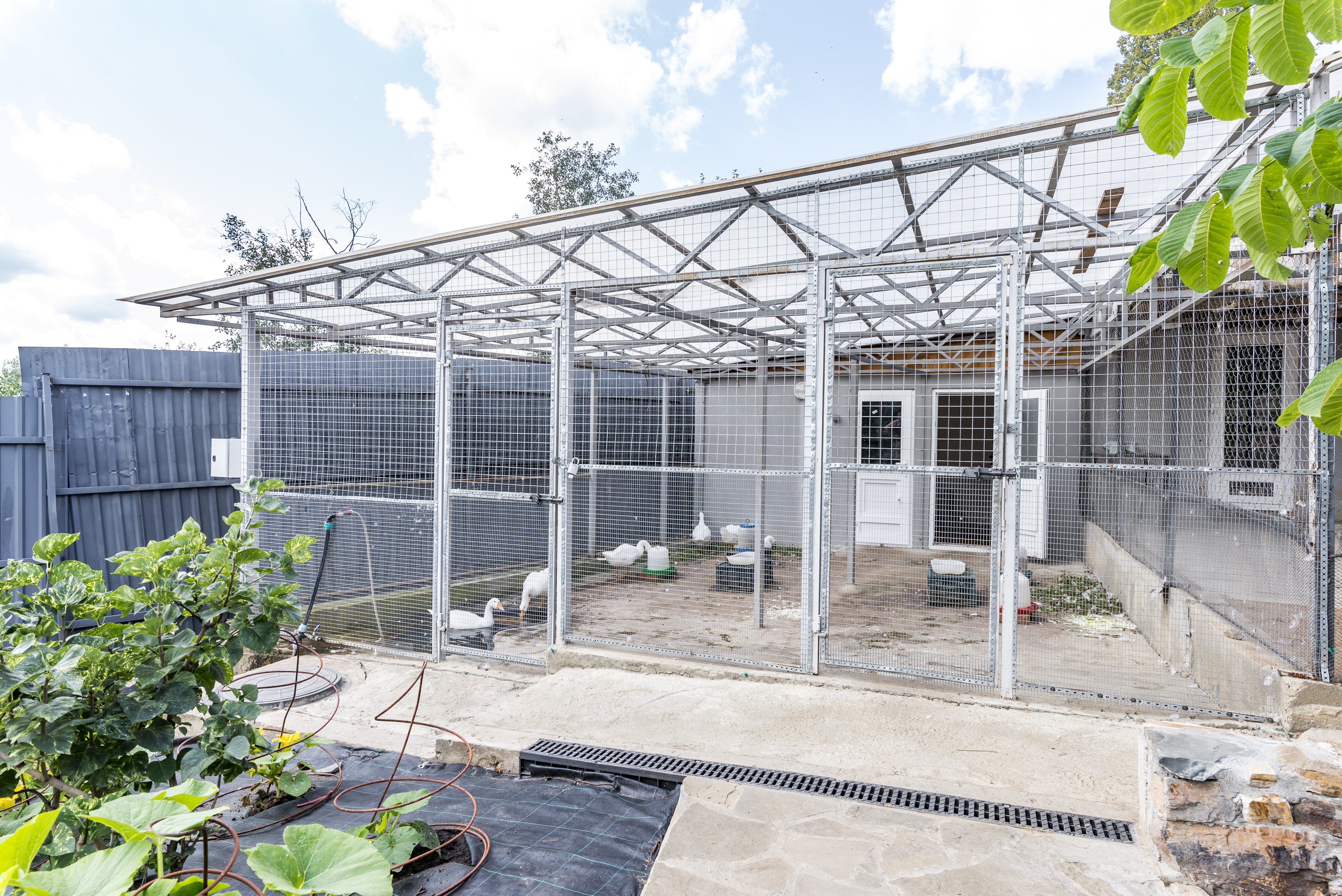 В дальнем уголке участка находится птичий двор, состоящий из 4 помещений: два из них - для выгула - с небольшим водоёмом (летом там можно выращивать водоплавающих); два других - для клеточного содержания бройлеров с весны по осень. Они укомплектованы специальными клетками, в том числе для круглогодичного содержания кур несушек.