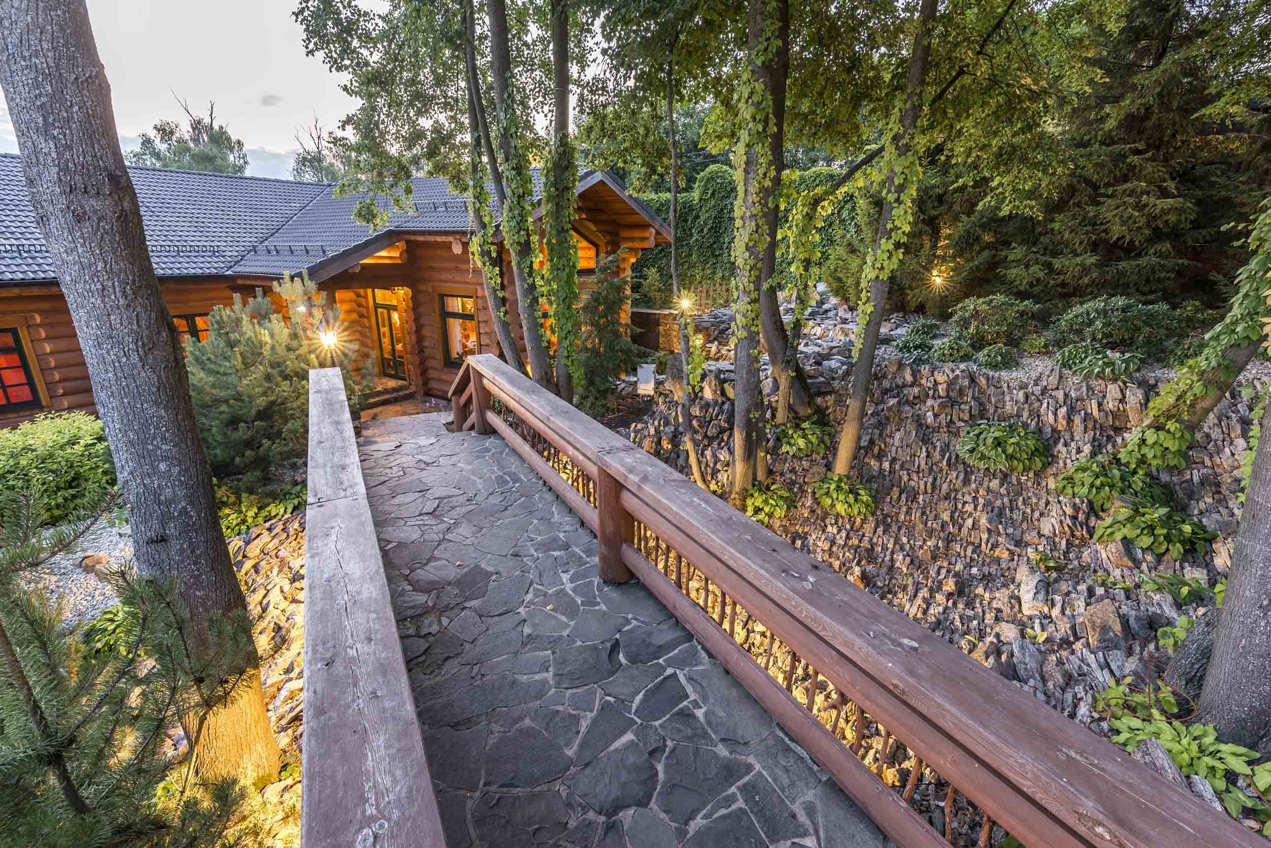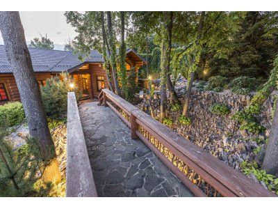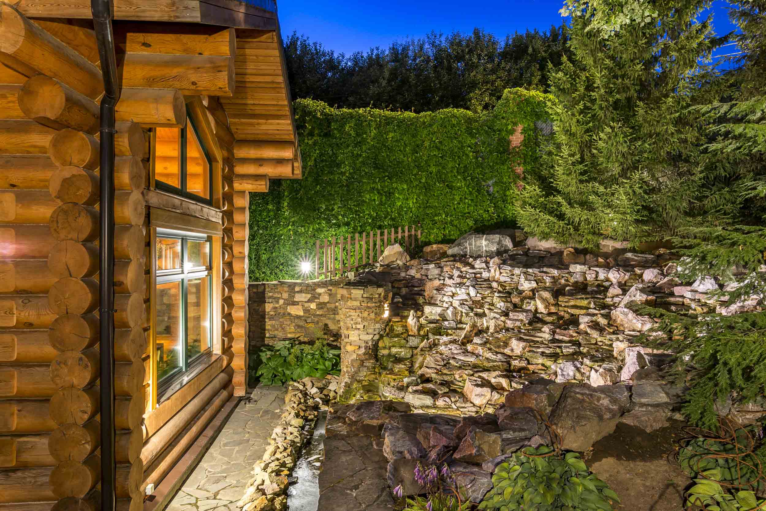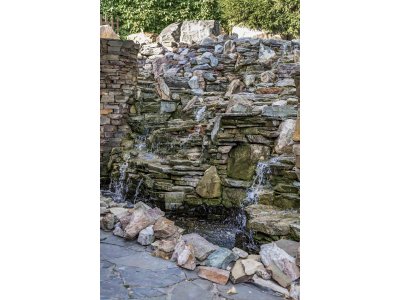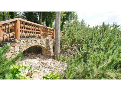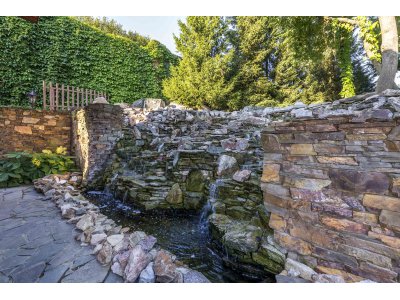 Перепад высот около гостевого дома оформлен искусственным водным каскадом с каменистым гребнем, редким по размерам и подбору камней.