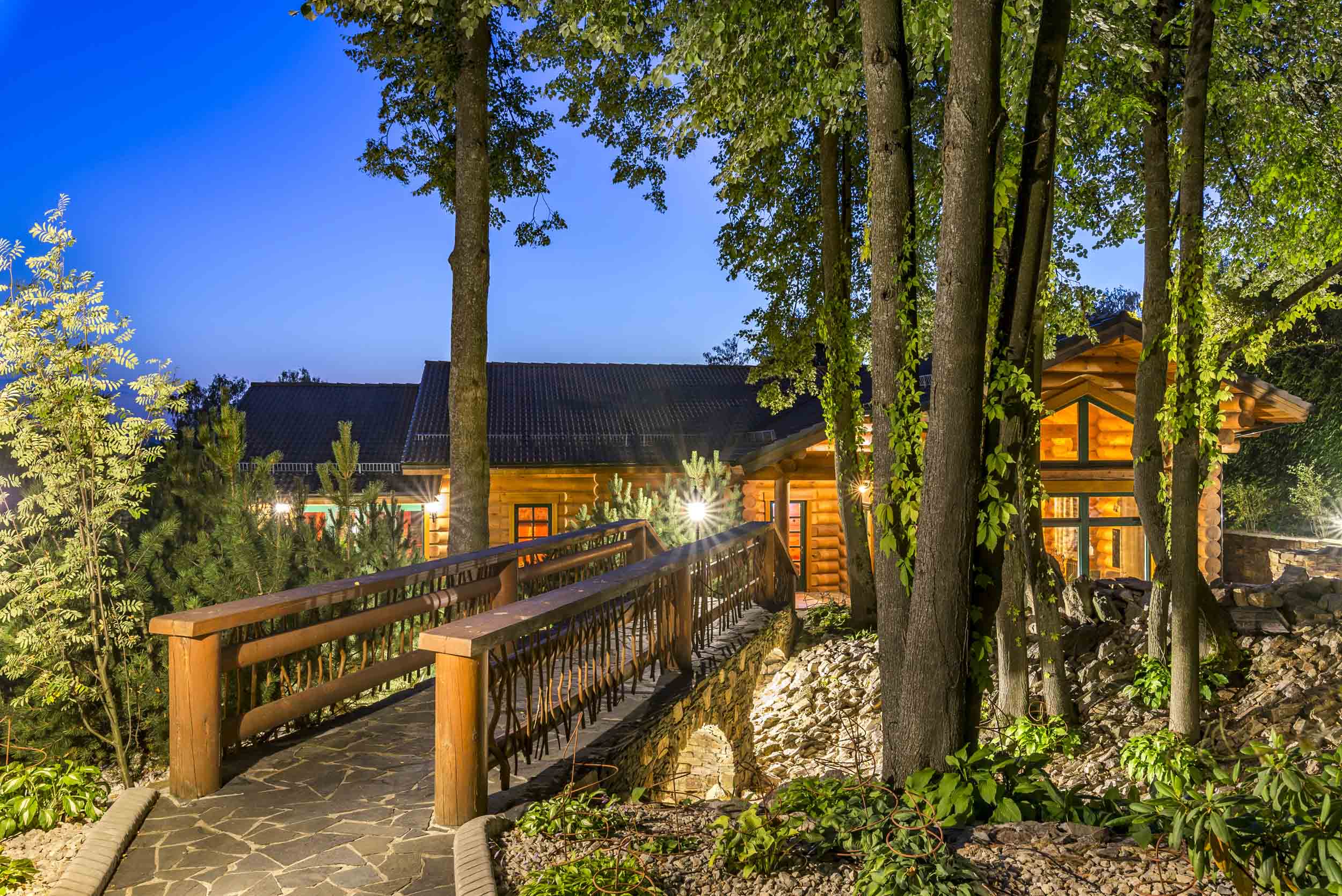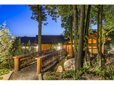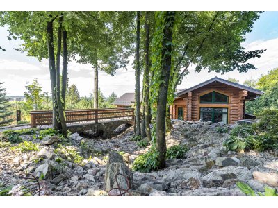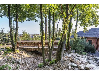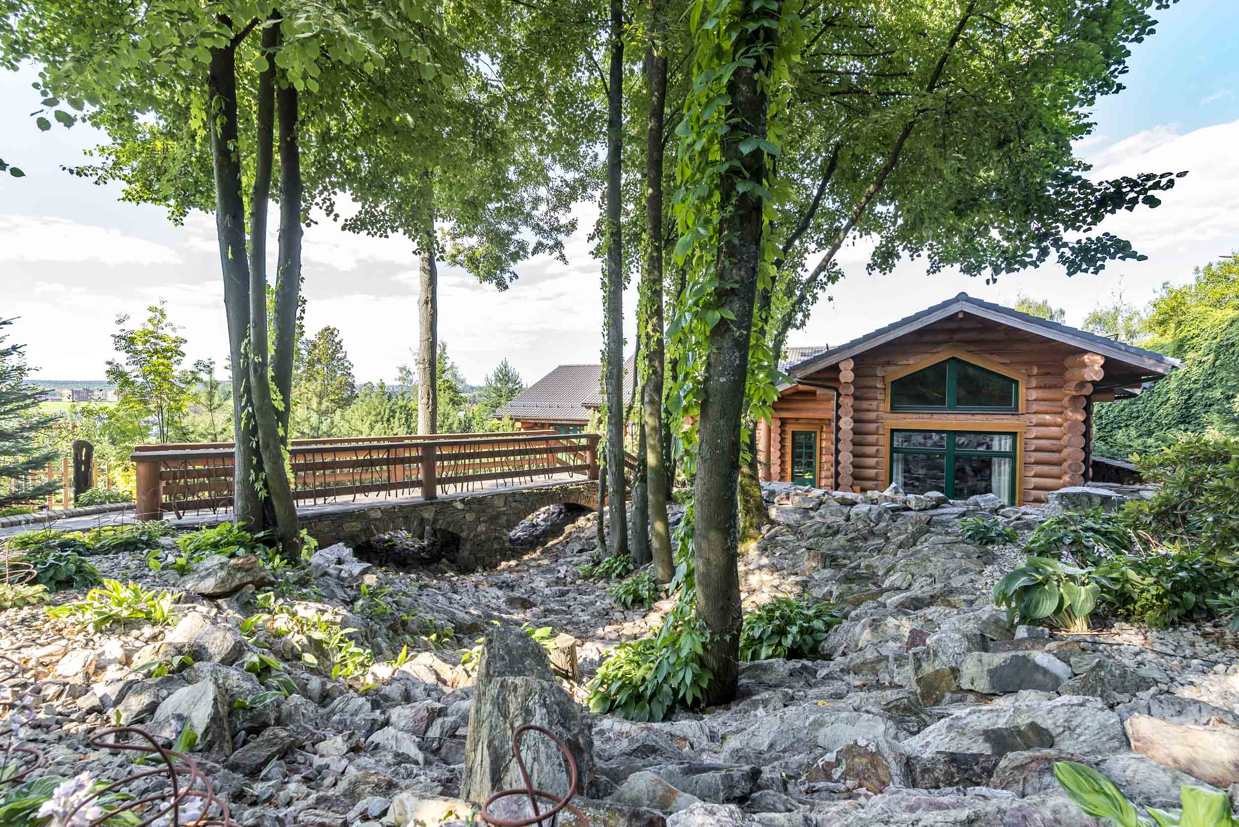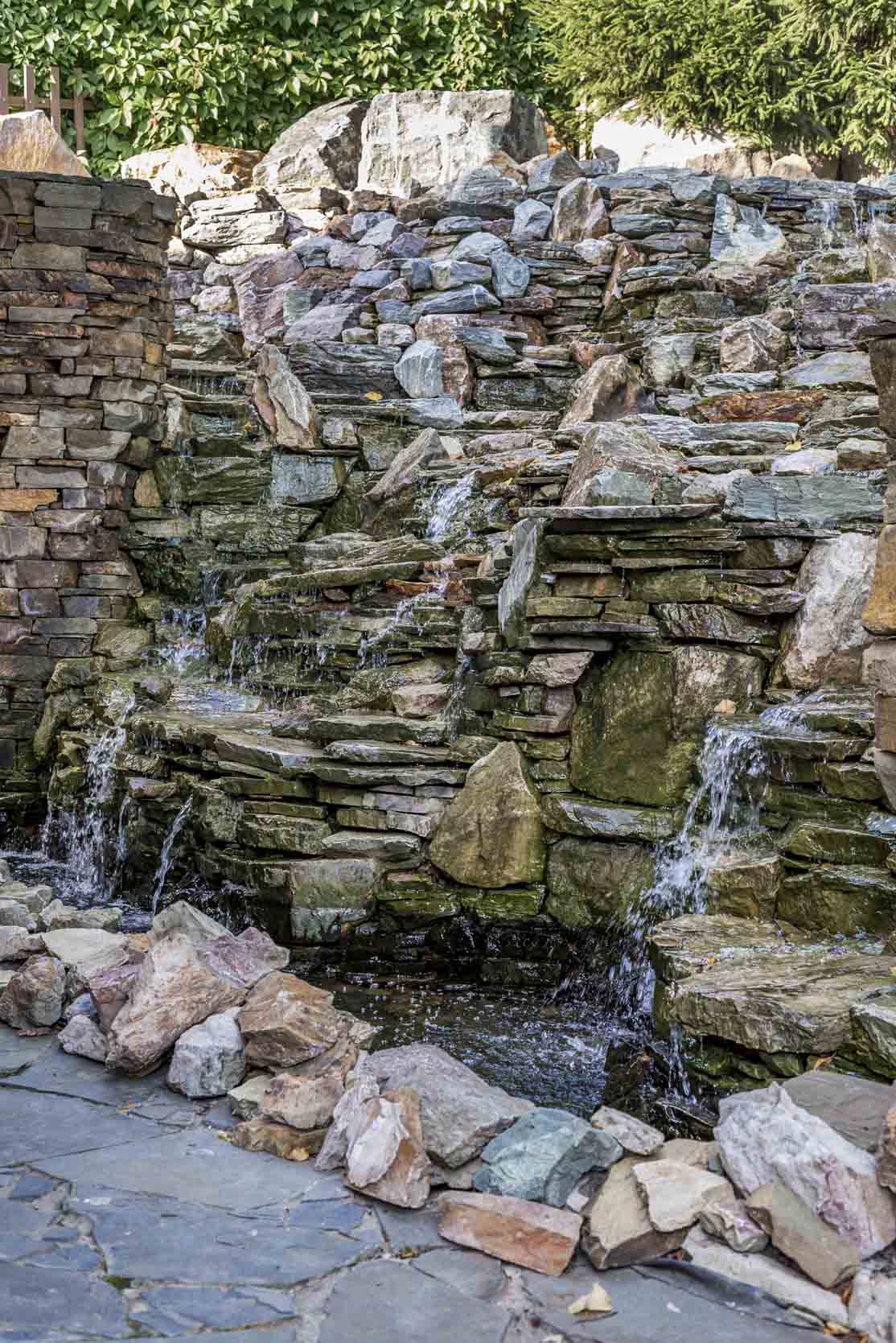 Перепад высот около гостевого дома оформлен искусственным водным каскадом с каменистым гребнем, редким по размерам и подбору камней.